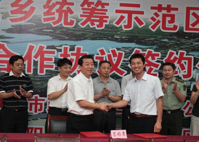 7月20日,鐘鑫公司董事長(zhǎng)王智高與黃金口工業(yè)園區(qū)建設(shè)發(fā)展有限公司董事長(zhǎng)唐群雁正式簽訂合作協(xié)議,成立武漢市漢陽(yáng)區(qū)城鄉(xiāng)統(tǒng)籌示范區(qū)建設(shè)開(kāi)發(fā)有限公司,共同統(tǒng)籌漢陽(yáng)區(qū)“七村一場(chǎng)”城鄉(xiāng)綜合改造,區(qū)委書(shū)記曹裕江、區(qū)相關(guān)部門(mén)領(lǐng)導(dǎo)、漢陽(yáng)市政領(lǐng)導(dǎo)胡紅勝、曾凡龍出席簽約儀式。