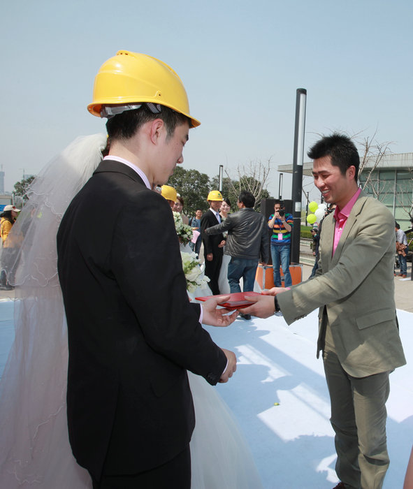 艷陽(yáng)高照,在美麗的月湖之畔,一段熱舞拉開了集體婚禮的帷幕。踏著神圣的婚禮進(jìn)行曲,八對(duì)新人依次入場(chǎng)。執(zhí)子之手、與子偕老,新人們?cè)陬I(lǐng)導(dǎo)和親朋好友的見(jiàn)證下發(fā)表了愛(ài)的宣言。新娘為新郎帶上象征著安全和責(zé)任的安全帽,而新郎則為新娘套上代表忠貞不渝的愛(ài)的戒指,在大家祝福的掌聲中,新人們熱烈擁吻,將婚禮氣氛推向高潮。