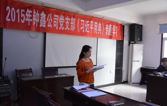 近期,公司全體黨員都以自我學習的方式進行了《習近平用典》的學習,為進一步加強黨員對《用典》的理解,鐘鑫公司于10月9日組織公司全體黨員在大會議室政開展“2015鐘鑫公司黨支部《習近平用典》專題學習”。 首先由主持人宣讀“關于開展《習近平用典》專題學習的通知”,并對《習近平用典》一書進行介紹,這本書從習近平總書記數百篇講話和文章中遴選出使用頻率高、影響深遠、最能體現(xiàn)習總書記治國理政理念的典故135則,分敬民、為政、修身、任賢、天下、法治等13個篇章,并對習近平總書記引用的每則典故,在解讀部分闡述了用典的現(xiàn)實意義,釋義部分詮釋了古典名句的出處和深邃的寓意。