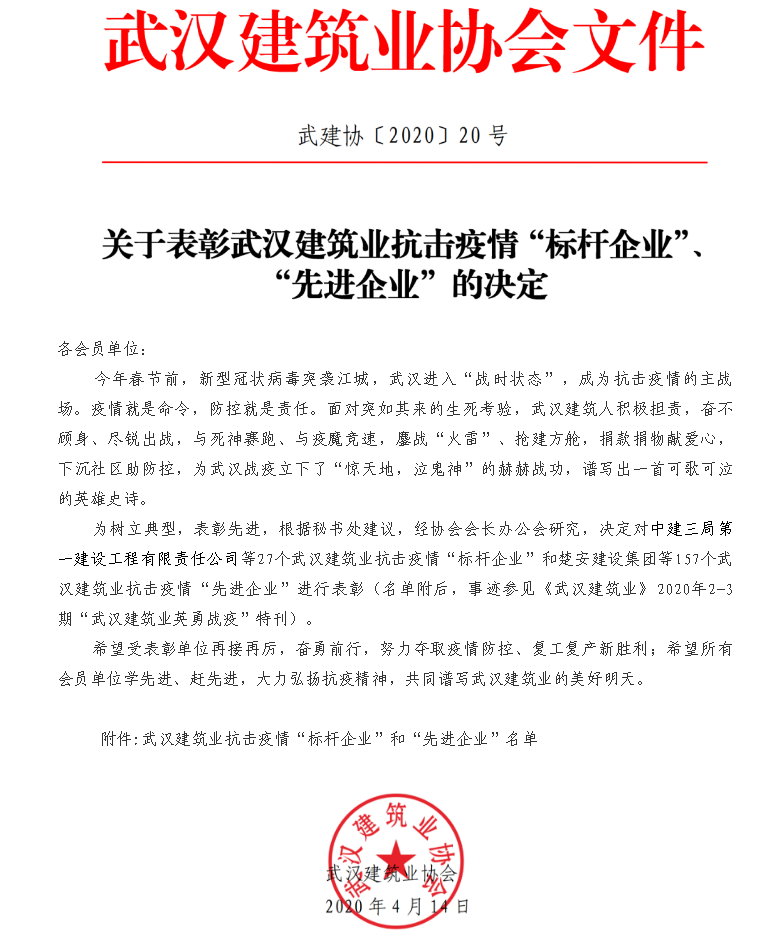 近日,武漢建筑業(yè)協(xié)會發(fā)布《武建協(xié)20號——關(guān)于表彰武漢建筑業(yè)抗擊疫情“標(biāo)桿企業(yè)”、“先進企業(yè)”的決定》,對在抗疫“主戰(zhàn)場”積極擔(dān)責(zé),奮不顧身、精銳出戰(zhàn),與死神賽跑、與疫魔競速的27家武漢建筑業(yè)“標(biāo)桿企業(yè)”、157家“先進企業(yè)”進行表彰。漢陽市政鐘鑫市政公司在抗疫過程中主動作為、勇于擔(dān)當(dāng),獲評“先進企業(yè)”榮耀稱號。